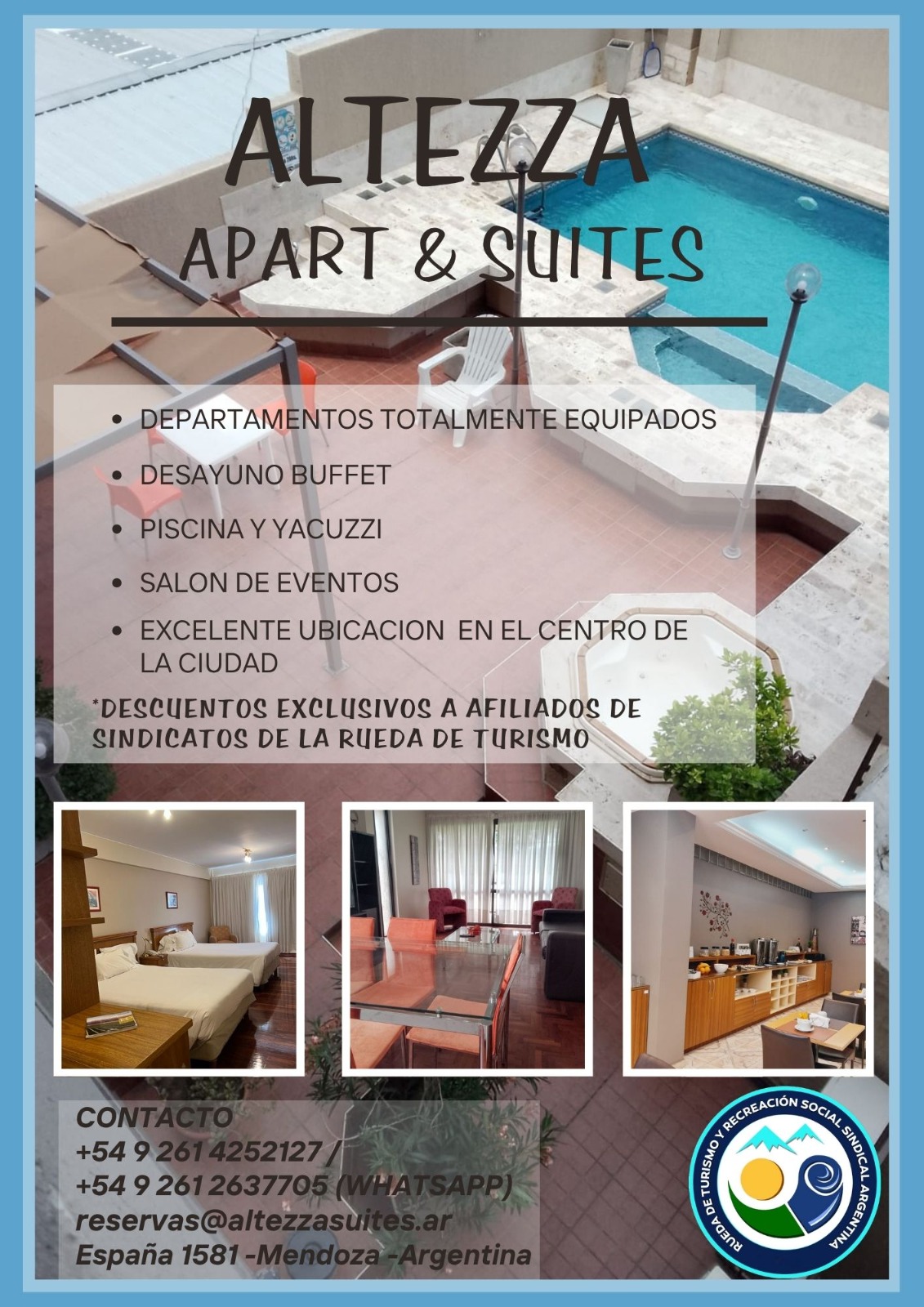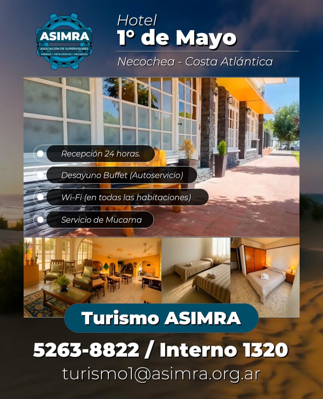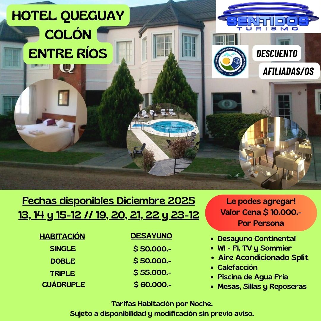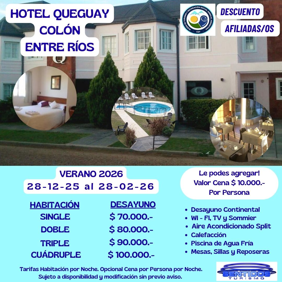 Alojamientos Hoteles sindicales Hoteles por convenio Hoteles sindicales Luz y FuerzaHotel en Mar del Plata. 90 plazas.Dirección: 25 de Mayo 4147.Para más información, comunicate con tu seccional. UatreHoteles en Necochea y Córdoba.Para más información, comunicate con tu seccional UdaHotel en CABA. 80 plazas. Dirección: Catamarca 185 . Para más información, comunicate con tu seccional AjeprocHoteles en CABA y Mar del Plata.Para más información, comunicate con tu seccional ApdfaHoteles en CABA y Córdoba. Para más información, comunicate con tu seccional UpsaHotel en Mar del Plata. 52 plazas. Dirección: Tucumán 2562. Para más información, comunicate con tu seccional AAEMMHoteles en Villa Gesell.Para más información, comunicate con tu sede central. FaremHotel en CABA. Para más información, comunicate con tu seccional Hotel AtepsaHotel en CABA. Dirección: Carlos Calvo 2342. Para más información, comunicate con tu seccional UpjetComplejo Recreativo en General Rodriguez.Contacto: turismo@upjet.org.ar. UciHoteles en Córdoba y Predio en Tigre. Para más información, comunicate con tu seccional. SUJPAVIFParque recreativo en Francisco Alvarez. Para más información, comunicate con tu seccional SiconaraCampo recreativo Para más información, comunicate con tu seccional SipegapHoteles en Bariloche, Santa Teresita, Mar del Plata y CórdobaPara más información, comunicate con tu seccional Sindicato de Conductores navales - Campo de recreoEn Longchamps, provincia de Bs.As.Para más información, comunicate con tu seccional Hotel 17 de octubre - San Carlos de BarilocheContacto: 5263-8822/ Interno 1320. Para más información, comunicate con tu seccional. Hotel 7 de Septiembre - San Clemente del TuyúContacto: 5263-8822/ Interno 1320. Para más información, comunicate con tu seccional. Hotel El Pueblito: Salsipuedes - CórdobaContacto: 5263-8822/ Interno 1320. Para más información, comunicate con tu seccional. Hotel 1° de Mayo - NecocheaContacto: 5263-8822/ Interno 1320. Para más información, comunicate con tu seccional. Hotel 1° de Julio: La Falda - CórdobaContacto: 5263-8822/ Interno 1320. Para más información, comunicate con tu seccional. Hoteles por convenio Vultur: Hoteles en CórdobaHoteles en Mina Clavero.Consultas y Reservas: 3544 611 933. Hotel Queguay - ColónAlojamiento en Colón, Entre Ríos.Descuentos exclusivos para afiliados. Hotel LatinoamericanoMar de Ajó.Consultas y Reservas: 02257 420254.. HOTEL LATINOAMERICANOHoteles en Mar de AjóConsultas y Reservas: 02257 420254 Mendoza: Altezza Apart & SuitesHoteles en Mendoza.Consultas y Reservas: 261 4252127 ¡Verano 2026 en Colón!BENEFICIO EXCLUSIVO PARA AFILIADOS ¡Atención! Sobre las tarifas publicadas, las/os afiliadas/os cuentan con un ¡15% DE DESCUENTO ADICIONAL!. ¡Verano 2026 en Colón!BENEFICIO EXCLUSIVO PARA AFILIADOS ¡Atención! Sobre las tarifas publicadas, las/os afiliadas/os cuentan con un ¡15% DE DESCUENTO ADICIONAL!.
